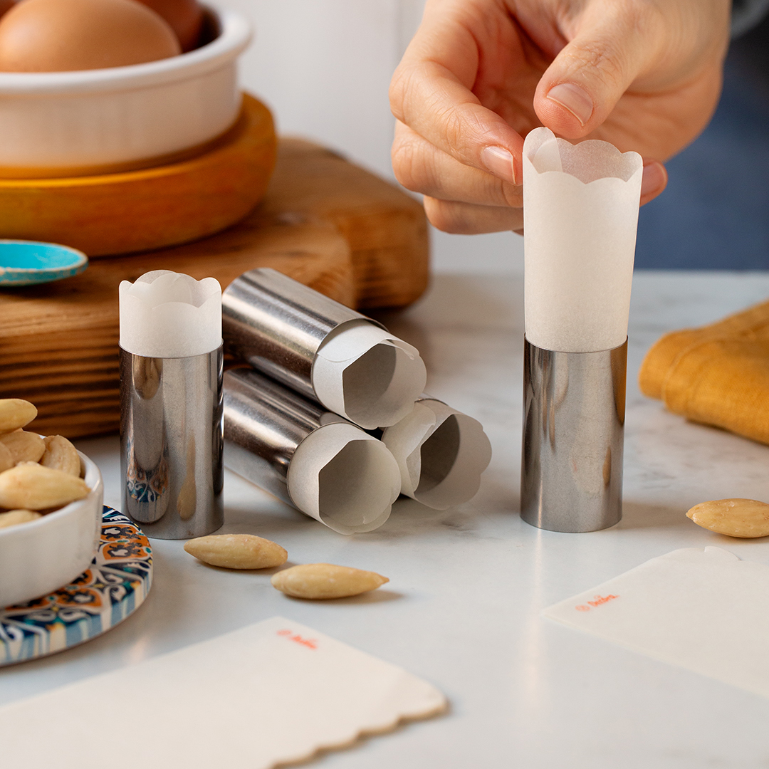 Cartine in carta da forno, con bordo ondulato, perfette per avvolgere il classico dolce della tradizione italiana , le cartucce “CARTU”, da vestire con un originale incarto. Da utilizzare con lo stampo per Cartucce Cartù.