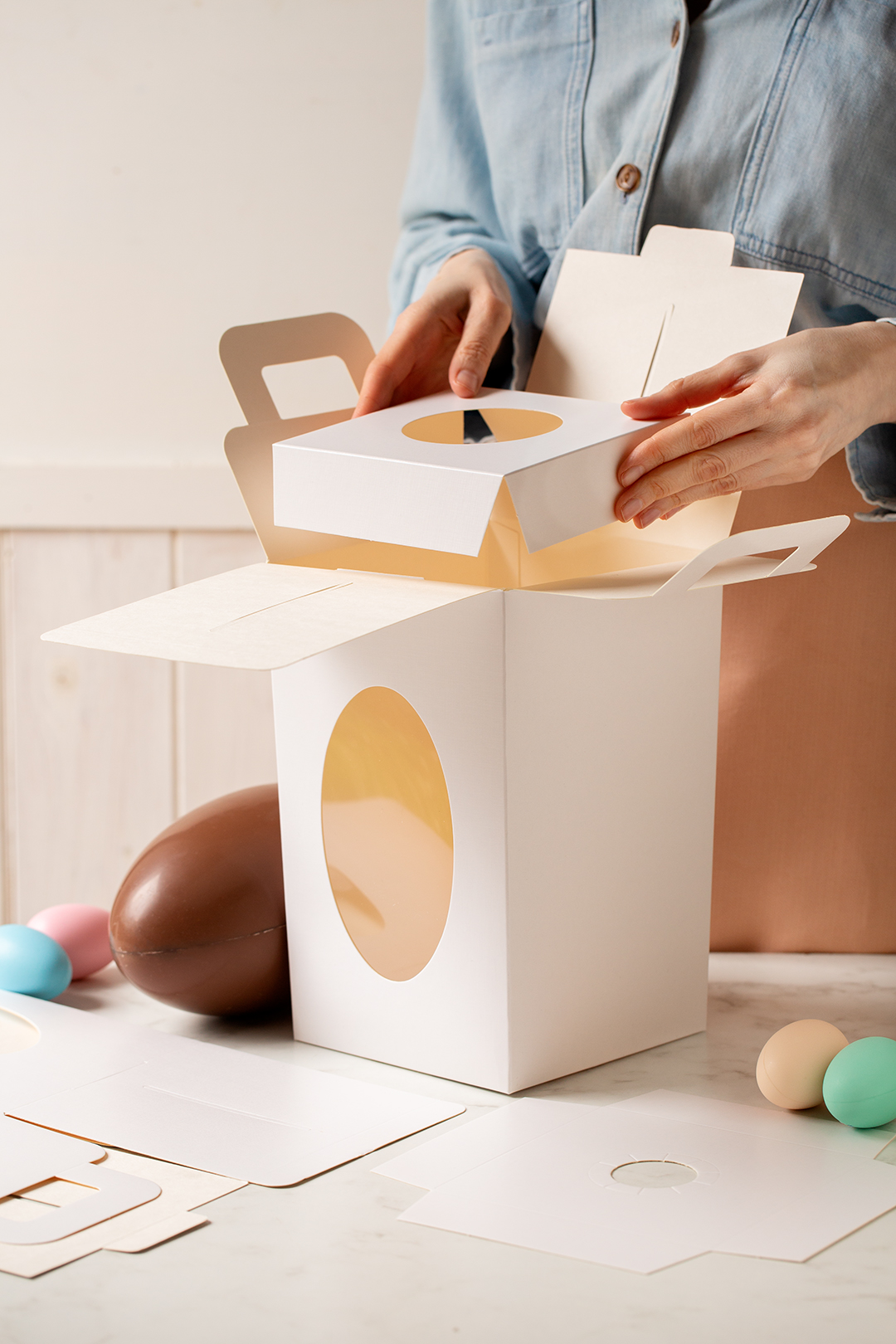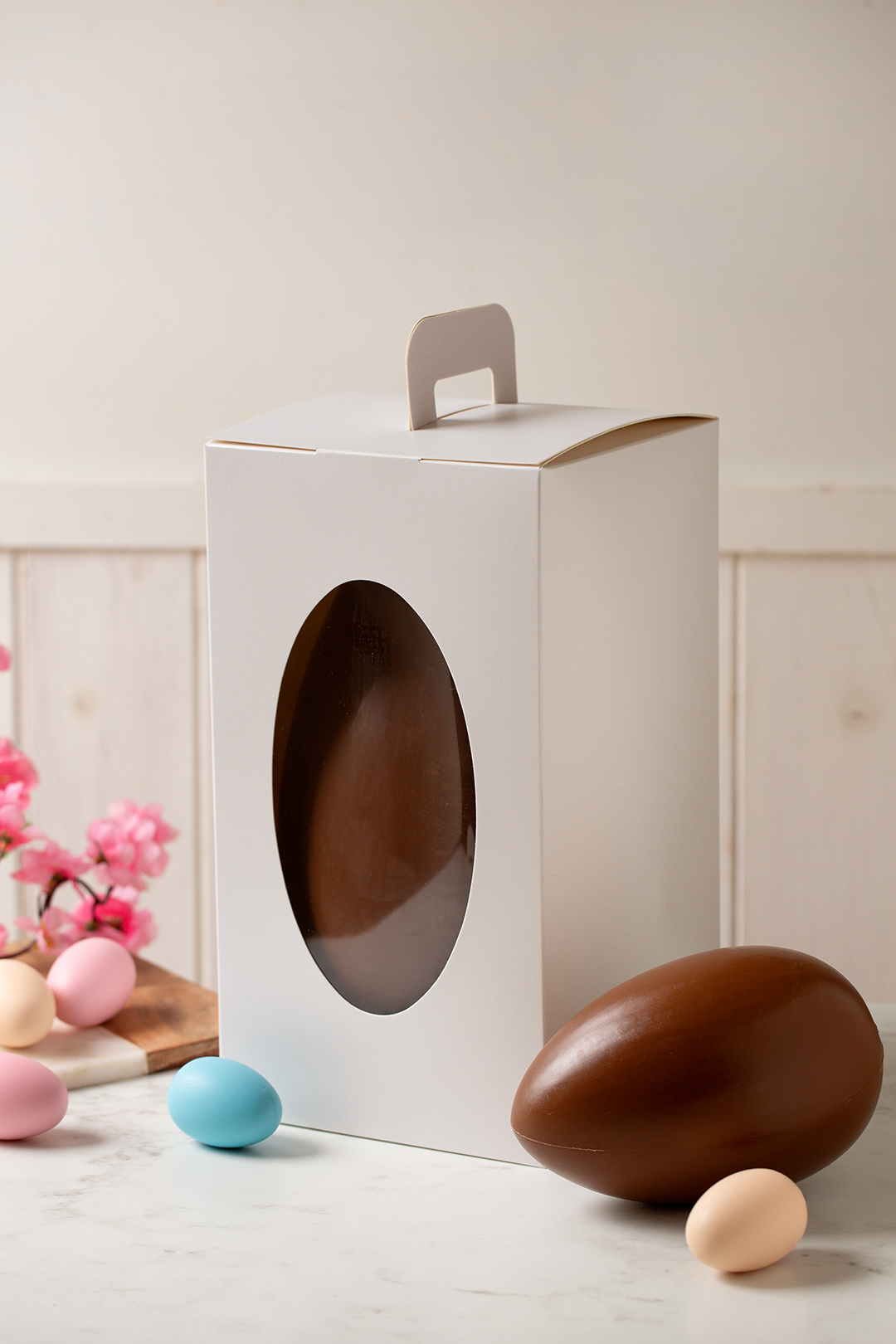 Scatole per uova di Pasqua con finestra in plastica trasparente. Realizzate in cartoncino idoneo al contatto alimentare con elegante texture telata in rilievo, con manico e doppia basetta: una inferiore per l’appoggio dell’uovo e una superiore per garantirne la stabilità durante il trasporto.